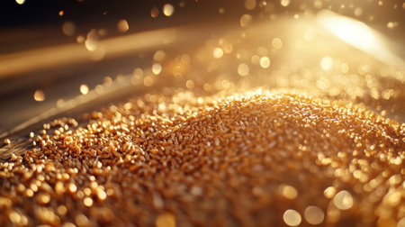 Close-up of golden grain falling and scattering in sunlight with a bokeh effect.