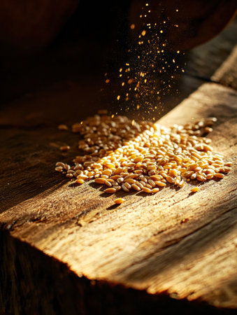 Close-up of golden wheat grains resting on a rustic wooden table, illuminated with warm lighting, creating a luxurious and premium food atmosphere.