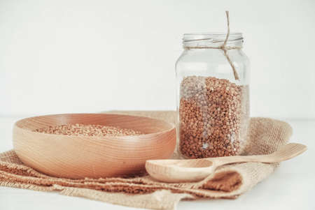 Buckwheat kernels in a glass jar, wooden bowl and spoon on white background. Copy, empty space for text.
