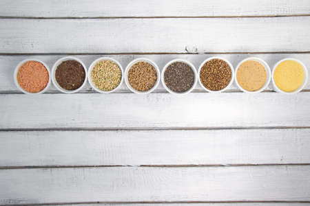 Collection of different groats on white background. Top view of buckwheat, chia, flax, amaranth, lentils, couscous, wheat