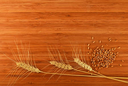 Wooden bamboo cutting board with three wheat ears and handful of ripe grains, add your text