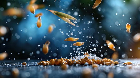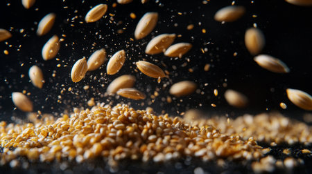 This captivating image showcases golden grains scattering downward, creating dynamic movement against a dark backdrop. Perfect for culinary themes.