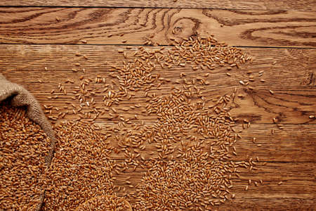 Scattered wheat grains on a wooden background, top view
