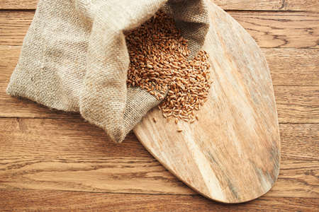 Wheat in a bag on a wooden table and dry leaves organic texture background image