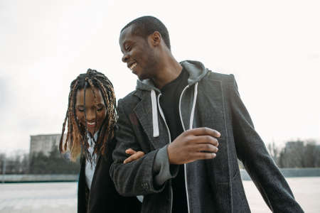 Active black couple have fun on urban backdrop. Happy African American. Joyful relationships, sky background, fashion style, happiness concept