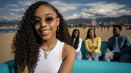 A young Black woman with curly hair and sunglasses smiles at the camera on a sunny day at the beach. Her friends are blurred in the background.