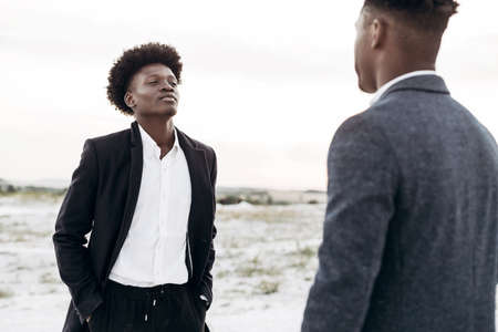 Two happy black fashionable men posing in the street, friends in classic black suits, fashion posing in nature, Menswear concept, shopping,