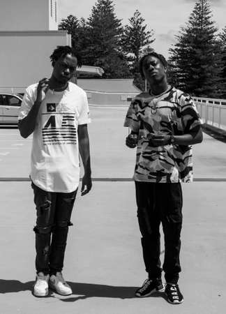 Focus on two young African American male rappers in trendy casual attire looking at camera while standing against houses in urban environment