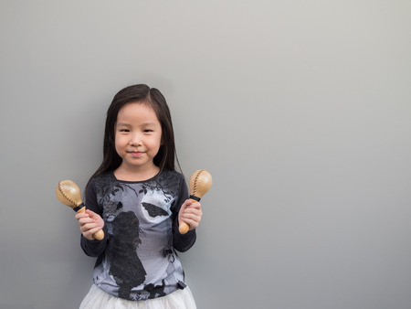 Little asian child play the maracas, gray background