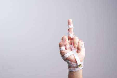 Hand with fuck you gesture wrapped by measuring tape on white background