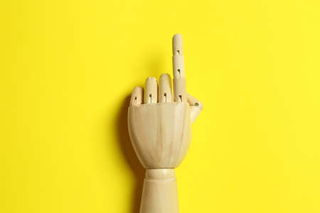 Closeup view of beautiful female hand with red color manicure isolated on yellow background. Female hand in gesture as if pointing to something invisible and virtual