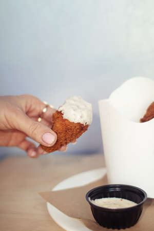 Close-up of chicken wings fried in batter. In a fast food restaurant, there is a cardboard box of chicken and sauce on the table. Sun rays fall beautifully on the hand of the girl who holds the food
