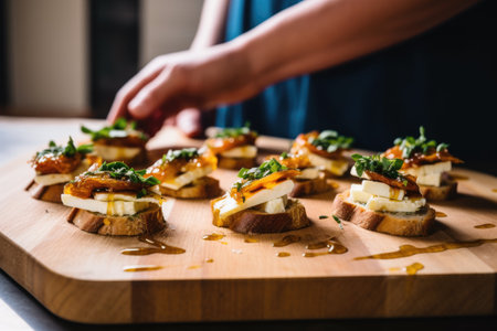 detail of hands placing fig pieces over cheese bruschetta