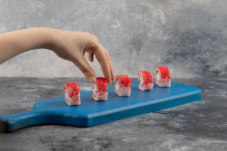 Female hand picking red sushi roll from blue cutting board