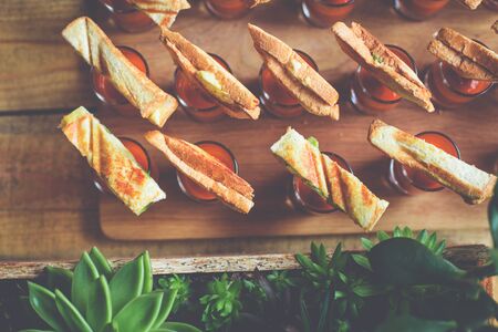mini sandwiches on sauce glasses and succulents on side