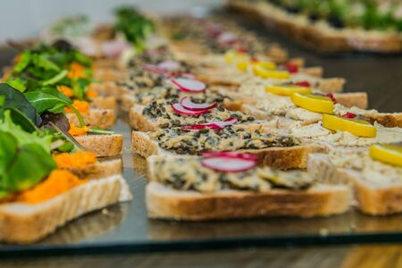 Detail of a canapes of a meal at an event, wedding, meeting or congress with food. Canapes decorated on the dish