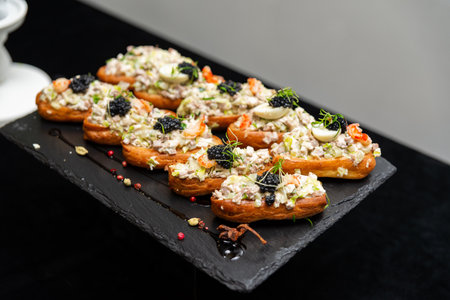 A delightful arrangement of seafood canapés on a slate platter. toppings include caviar, herbs, and diced vegetables, perfect for elegant gatherings or sophisticated events.