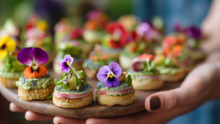 Female hands holding delicious canapes with edible flowers, closeup view