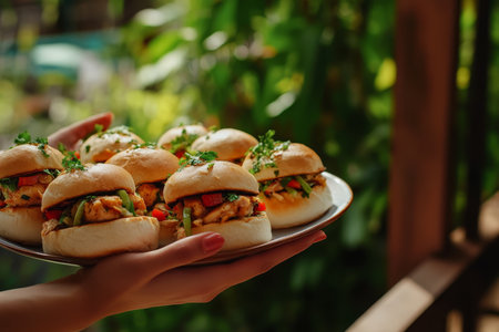 Close up of hands holding fresh chicken sandwiches with herbs and vegetables in a garden setting