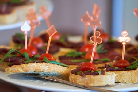 Close-up big plate with serving snack canapes fried bread tomato parsley and salami