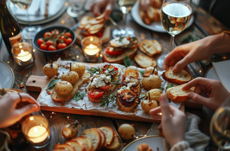 A cozy holiday table setting featuring an assortment of delicious appetizers, a glass of red wine, a bottle of wine, and flickering candles.