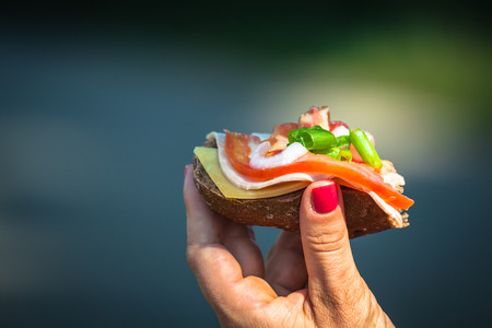 Close up of female hand holding canape. Buffet meal event concept.