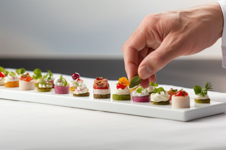 Accurate chefs hand placing final garnish on fingerfood isolated on a white background