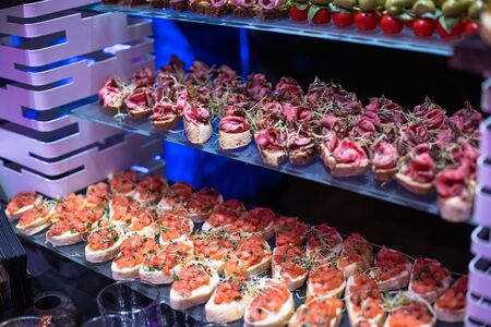 Catering service with ready-made snacks. Canapes on serving table. Slices of ham on bread. decoration of dishes for buffet party. Banquet service. catering food