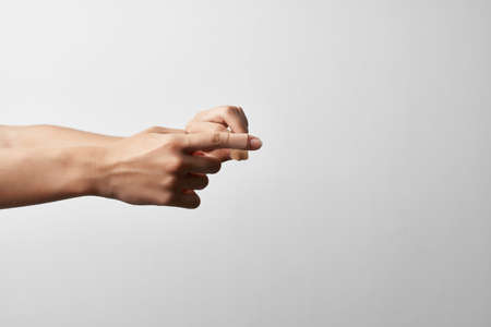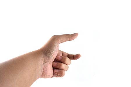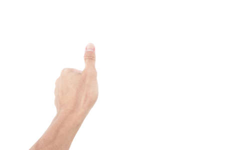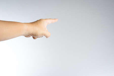 Close-up of male hand showing direction with finger on white background.