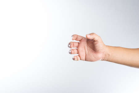 Hand in holding bottle pose isolated on white studio background