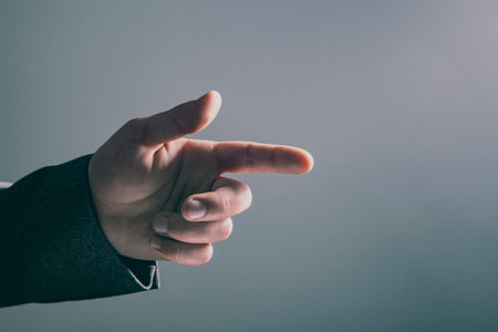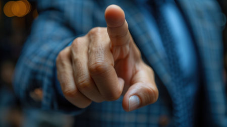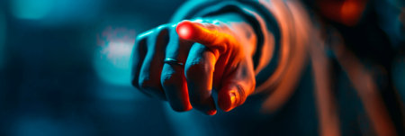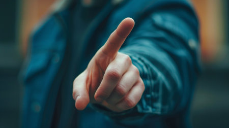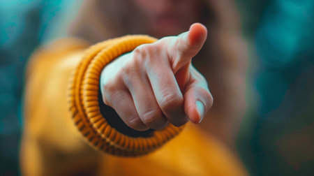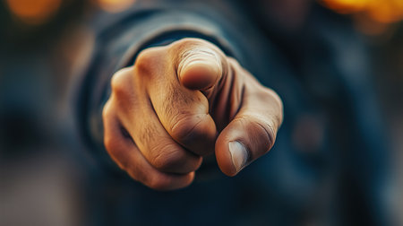 Close-up of hand pointing index finger towards viewer, creating a sense of accusation or confrontation. Ai generated