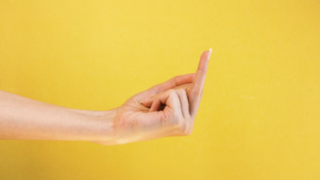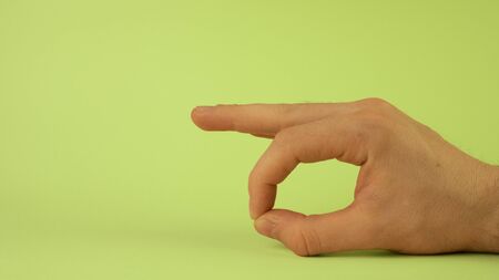 Close-up of hand gesture of picking up something. Male hand holding something invisible isolated on yellow background.