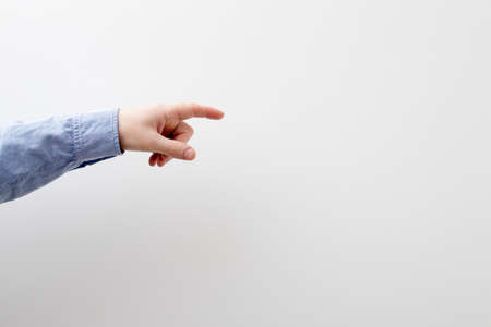 Man's hand in a blue shirt touching or pointing to something on white wall background. Close up. Copy space