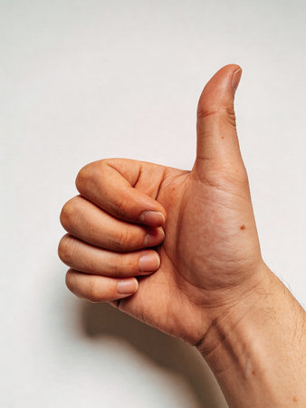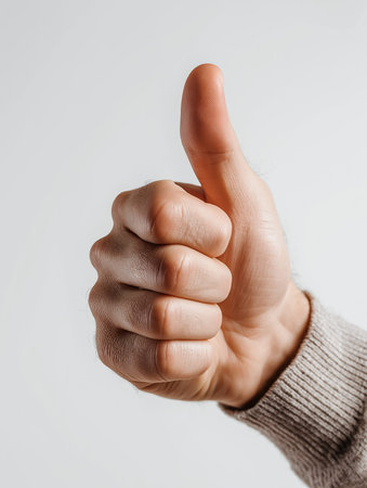 A hand confidently shows a thumbs up, radiating positivity and support in a bright setting.