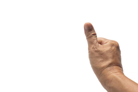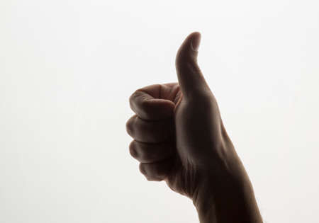 Male hand showing thumb up sign on white background. Close up.