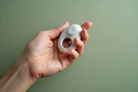 Smart Ring Technology. Hand holding a modern white smart ring device with button on green background for health monitoring.