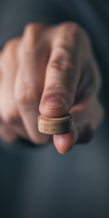 Hand holding wooden token with focused finger pointing in selective focus close up.