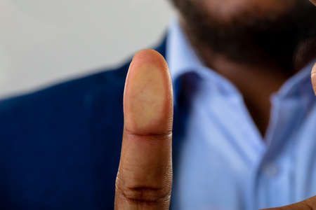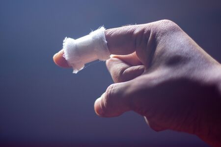 Close up of male injured finger with medicine bandage.