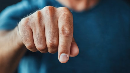 A fair-skinned Caucasian man's fist thrusts towards the viewer, slightly blurred His prominent index finger centers the frame Against a deep blue backdrop, the image conveys determination, power, or aggression The visible fingernail and ready stance suggest confrontation, challenge, or a forceful point This hand is poised for action AI Generative