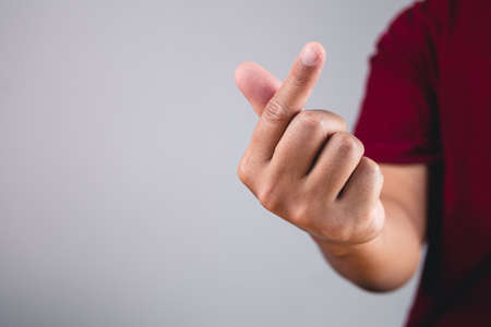 Finger heart in korean style. Sign of love isolated on white and grey background. Valentine's day concept.