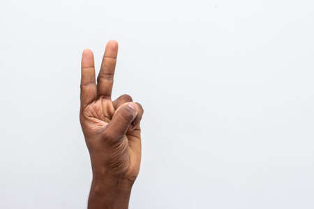 Boy hand showing number two gesture symbol isolated on white background. Gesturing number 2. Number two in sign language. counting down two concept. two fingers up. man hand sign victory gesture.