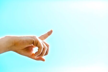 The hand is pointing towards the clouds in the beautiful blue sky. Hand symbol points to the light or sunshine. and copy space.