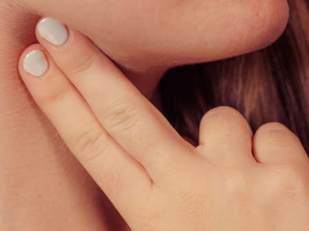 woman hand self checking thyroid gland on her neck