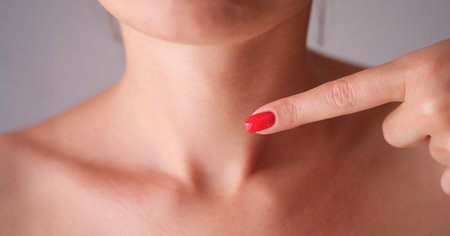Woman with red manicure pointing finger at neck area with thyroid gland closeup