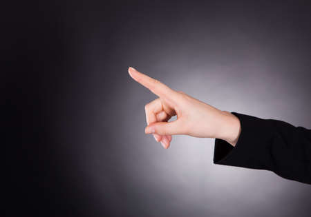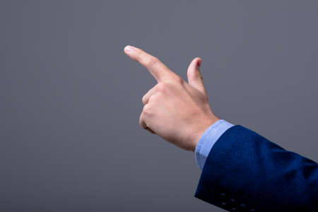 A close-up shot of a person's hand in a suit jacket, with the index finger extended and pointing to the left.