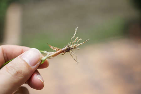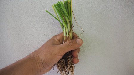 A close-up of a hand holding freshly harvested green vegetation with roots, showcasing the connection between human effort and nature's bounty. Perfect for agricultural themes.