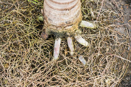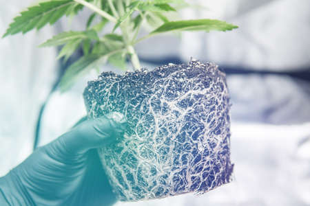 CBD in roots Marijuana. Macro healthy cannabis roots. Professional cannabis cultivation grow. Roots In the hands of the grower, the beautiful roots of the marijuana plant.