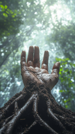 Muddy hand reaching towards sunlight in forest, nature and growth concept