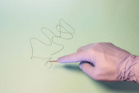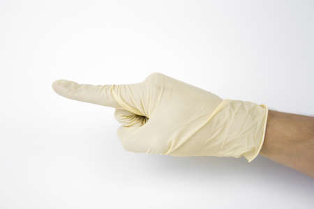 The doctor's hand in a blue glove shows the index finger on a white background with space for text. Banner for medical clinic, photo for medicine and pharmacy
