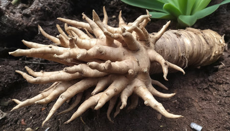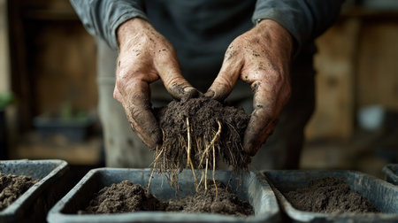 Hands covered in dirt carefully display freshly harvested organic roots, showcasing the beauty of nature's produce. The moment captures the joy of farm life and sustainable agriculture.